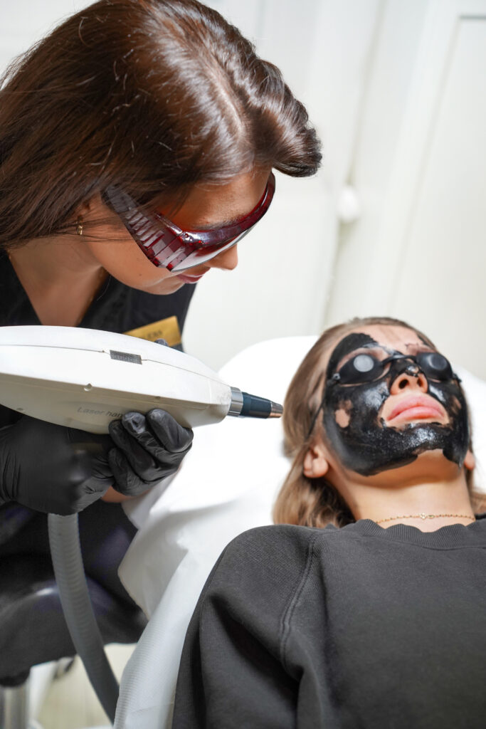 Peeling węglowy to zaawansowany zabieg oczyszczający, wykonywany przy użyciu lasera Q-Switch i preparatu z aktywnym węglem. Węgiel wiąże zanieczyszczenia i nadmiar sebum, a następnie laser delikatnie usuwa martwe komórki skóry, głęboko oczyszczając i odświeżając cerę. Efekty są widoczne od razu, dlatego zabieg często nazywany jest „zabiegiem bankietowym” – skóra wygląda świetnie i nie wymaga rekonwalescencji!